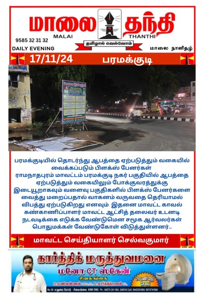 BREAKING NEWS பரமக்குடியில் தொடர்ந்து ஆபத்தை ஏற்படுத்தும் வகையில் வைக்கப்படும் பிளக்ஸ் பேனர்கள் 1 min read Spread the love Continue Reading Previous தேசிய பத்திரிக்கை தின வாழ்த்துகள்Next பழனியில் கள்ளலாட்டரி பறிமுதல் ! More Stories 1 min read BREAKING NEWS தேவகோட்டை ஸ்ரீ மீனாட்சி சுந்தரேஸ்வரர் ஆலயத்தில்தெய்வாணை முருகன் திருக்கல்யாணம் நடைபெற்றது 1 min read BREAKING NEWS நாகர்கோவில் மாநகராட்சி 16-வது வார்டில் கான்கிரீட் தளம் அமைக்கும் பணியினை மேயர் ரெ.மகேஷ். தொடங்கிவைத்தார். 1 min read BREAKING NEWS பரமக்குடியில் நடைப்பெற்ற தேவேந்திர பண்பாட்டு கழக செயலாளர் தேர்தலில் ஆ,ராமகிருஷ்ணன் வெற்றி