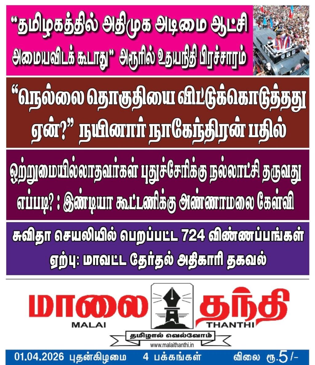 E-PAPER 1/04/2026-malaithanthi_e-paper# 1 min read Spread the love Continue Reading Previous 31/03/2026-malaithanthi_e-paper#Next 2/04/2026-malaithanthi_e-paper# More Stories 1 min read E-PAPER 13/04/2026-malaithanthi_e-paper# 1 min read E-PAPER 12/04/2026-malaithanthi_e-paper# 1 min read E-PAPER 11/04/2026-malaithanthi_e-paper#