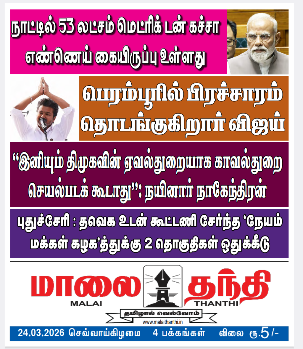 E-PAPER 24/03/2026-malaithanthi_e-paper# 1 min read Spread the love Continue Reading Previous 23/03/2026-malaithanthi_e-paper#Next 25/03/2026-Malai Thanthi_ e-paper# More Stories 1 min read E-PAPER 14/04/2026-malaithanthi_e-paper# 1 min read E-PAPER 13/04/2026-malaithanthi_e-paper# 1 min read E-PAPER 12/04/2026-malaithanthi_e-paper#